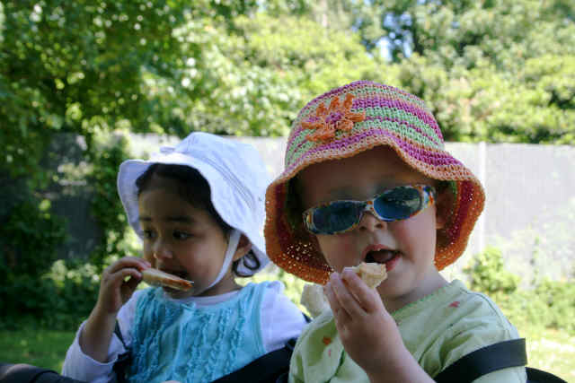 As the foundations for good health and eating patterns are laid in the early years, we make it our duty to encourage good habits. We eat together at the table and make meals a social time. Our food is home made, using fresh products that are in season, usually organic and fair-trade. We only drink water during and between meals, except for breakfast and snack times for babies when we serve milk. We offer healthy snacks such as oat cakes, rice cakes, or bread-sticks with fruit and cheese. We make our own oat cakes and flapjacks with no added sugar. We usually bake a yoghurt cake for birthdays, to which we add coconut, fruit or chocolate chips (the latter being a favourite!). We strongly discourage parents/ carers from giving children unhealthy food such as crisps, sweets, gums, lollipops fizzy or soft drinks to bring to our setting.